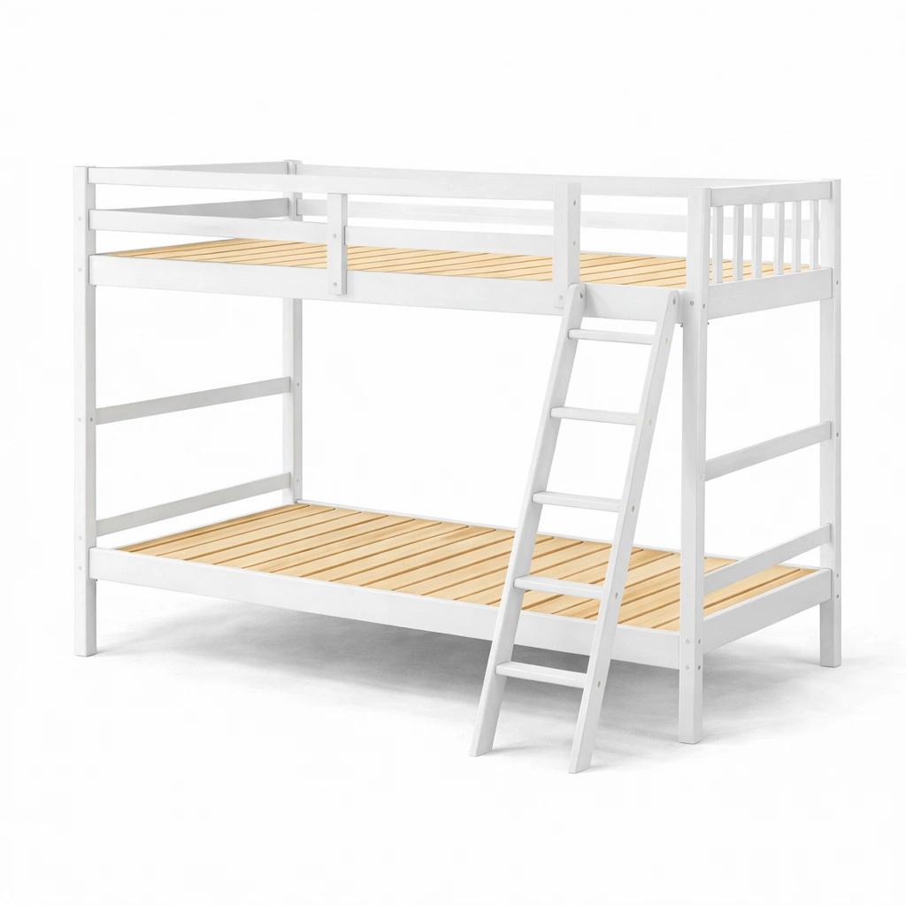 Letto a castello realizzato in legno di pino massello con finitura bianca e doghe naturali. Include scala laterale removibile. Adatto per bambini dai 6 anni in su.