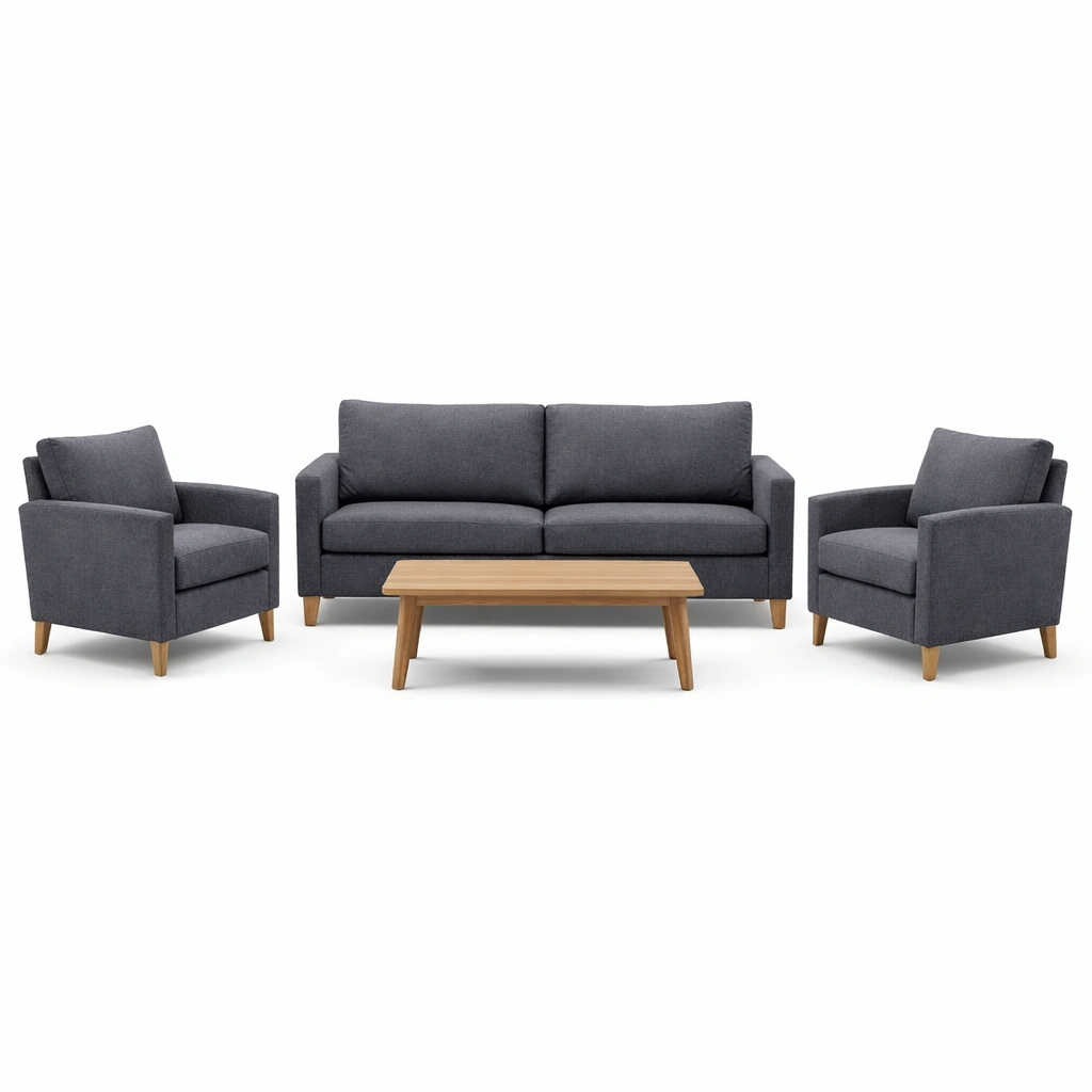 Set di mobili composto da un divano a 3 posti, due poltrone e un tavolino.